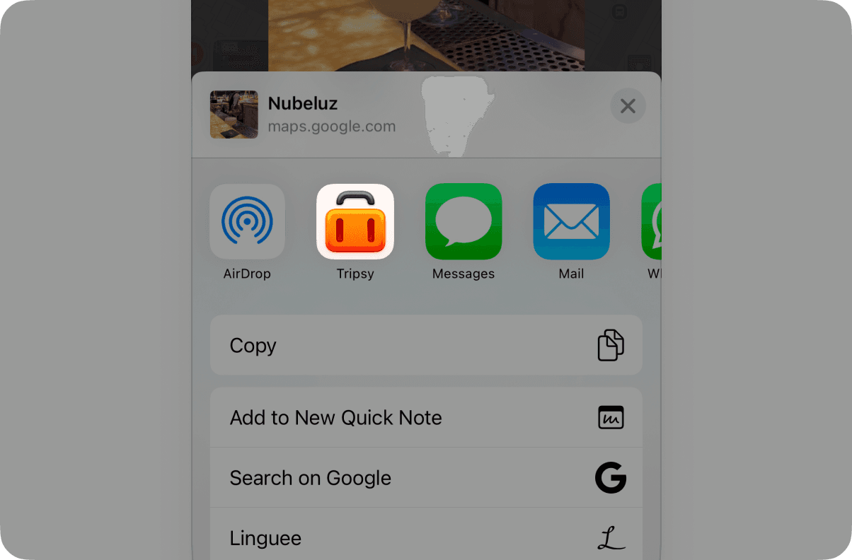 Using the Share Extension of Tripsy allows you to insert data from one app to your itinerary. In this example we are going to present how to use it from Google Maps on iOS, but the steps are also valid for iPadOS.